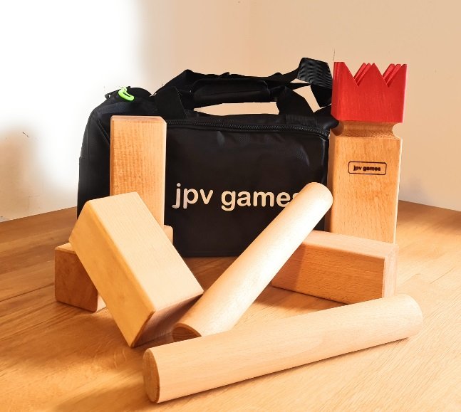 - Größtest Kubb-Maß bei Turnieren: 6x Wurfholz Länge 300mm Durchmesser 45mm, 10x Kubbs Höhe 150mm Breite 70x70mm, 1x König Höhe 300mm Breite 90x90mm, 6x Feldmarkierungen, schwarze jpv games-Tasche