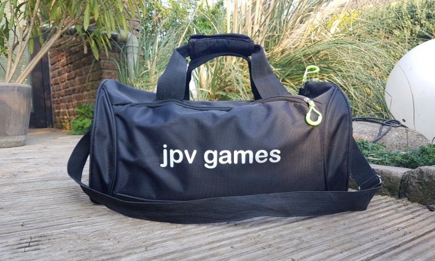 - mit stabiler schwarzer jpv games-Tasche mit Tragegurt.